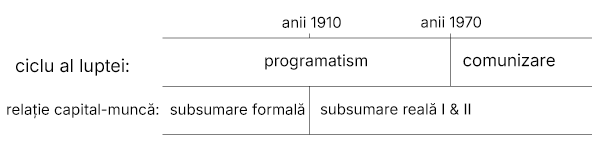 Ruptura de periodizare pe care o prezentăm în acest articol are multe în comun cu cea a TC.6 Perspectiva noastră a apărut, în parte, dintr-o încercare de a evalua teoria TC în raport cu istoria globală a mișcării muncitorești de-a lungul secolului al douăzecilea. O diferență între expunerea noastră și a lor este că TC încearcă să își fundamenteze periodizarea în categoriile marxiene ale subsumării formale și reale. Pentru Marx, acești termeni se refereau în mod specific la transformarea procesului de muncă; TC îi aplică relației capital–muncă în ansamblu și chiar societății capitaliste.7 Ei plasează ruptura dintre subsumarea formală și cea reală în jurul Primului Război Mondial, apoi o împart în două faze distincte. Peste această periodizare structurală — a „formei” „relației capital–muncă” — suprapun o a doua periodizare — a comunismului, sau a ceea ce numesc „cicluri de luptă” — în care faza actuală, începând din anii 1970, corespunde unei a doua faze a subsumării reale: